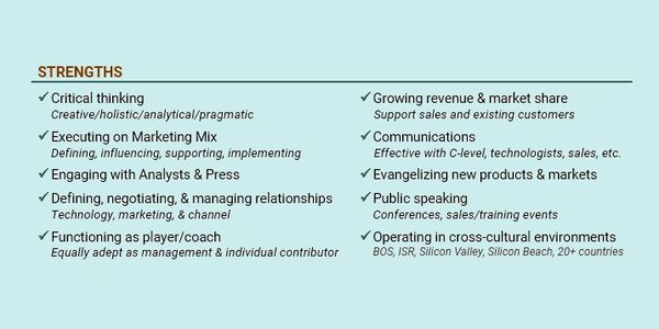 Additional skills include competitive Intelligence, product launches, and public speaking. I am certified in Pragmatic and Solutions Marketing.